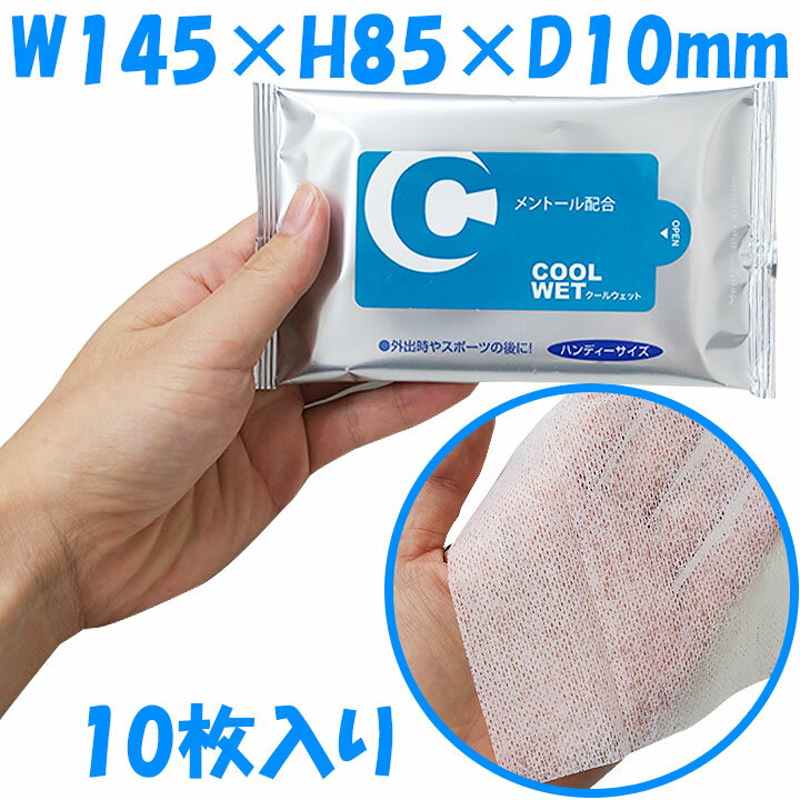 ■販売名 クールウェット ■パッケージサイズ W145×H85×D10mm ■寸法 約200×150mm ■紙質 不織布 ■素材 レーヨン・ポリエステル ■成分 精製水、エタノール、塩化ベンザルコニウム、パラベン、PG、ℓ-メントール ■枚数 10枚入り ■備考 1000個からフラップ部分に名入れが出来る商品です。