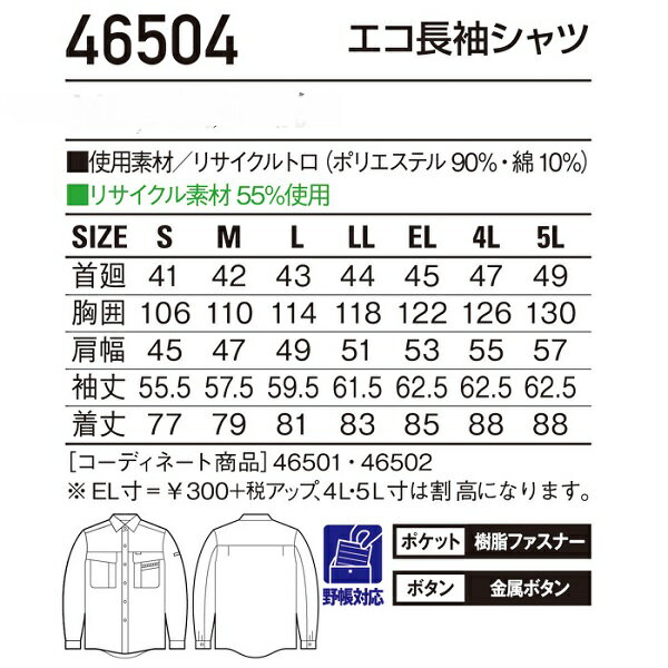 自重堂 作業服 作業着 エコ長袖シャツ 46504 S M L LL 春夏用 通気性抜群 速乾性抜群 帯電防止素材使用 麻感覚の清涼素材が快適ワークをしっかりサポート ポリエステル90% 綿10%自重堂 作業服 作業着 エコ長袖シャツ 46504 S M L LL 春夏用 通気性抜群 速乾性抜群 帯電防止素材使用 麻感覚の清涼素材が快適ワークをしっかりサポート ポリエステル90% 綿10%