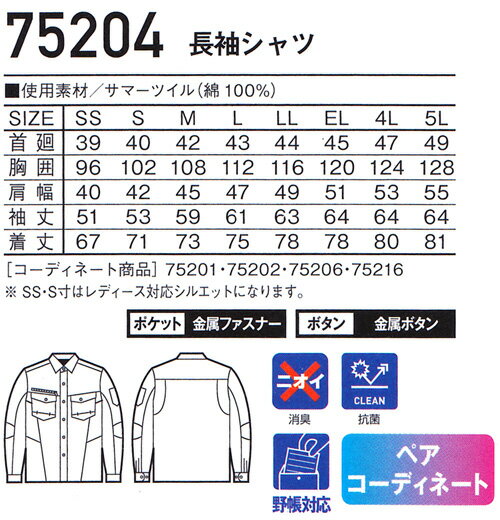 コーディネート商品 75200 長袖ジャンパー&75201 ノータックパンツセット(上下同色) 75200 長袖ジャンパー&75202 ノータックカーゴパンツセット(上下同色) 75200 長袖ジャンパー&75206 レディースパンツ(裏付)セット(上下同色) 75200 長袖ジャンパー&75216 レディースカーゴパンツ(裏付)セット(上下同色) 75204 長袖シャツ&75201 ノータックパンツセット(上下同色) 75204 長袖シャツ&75202 ノータックカーゴパンツセット(上下同色) 75204 長袖シャツ&75206 レディースパンツ(裏付)セット(上下同色) 75204 長袖シャツ&75216 レディースカーゴパンツ(裏付)セット(上下同色)